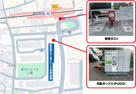 団地の横に宅配ボックス「PUDO」が設置されており、駅前には郵便ポストもあるため、発送業務はアプリを通じて最小限の手間で行えます。