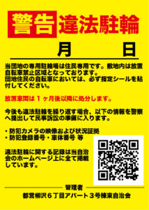 当団地は駅前に位置しているため、公共の駐輪場代わりに利用されるといった迷惑行為が多く発生しています。これらの不正利用に対しては、法律に基づき厳正に対応します。駐輪場周辺には自治会管理の防犯カメラを設置しており、すべての映像が記録されています。また、団地の敷地内道路は、西東京市が定める「放置自転車等禁止区域」に指定されています。