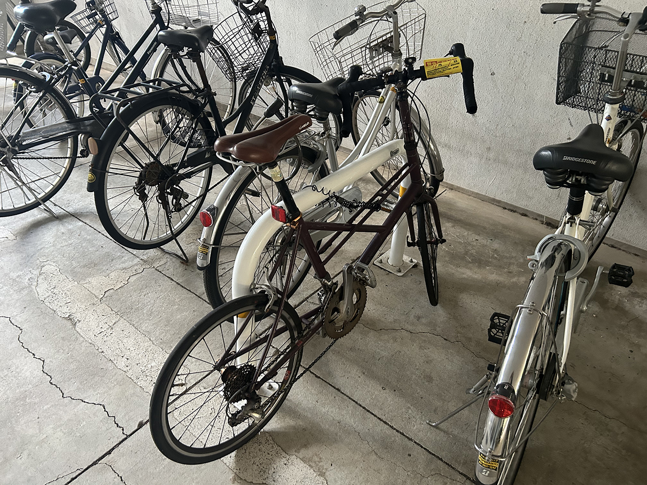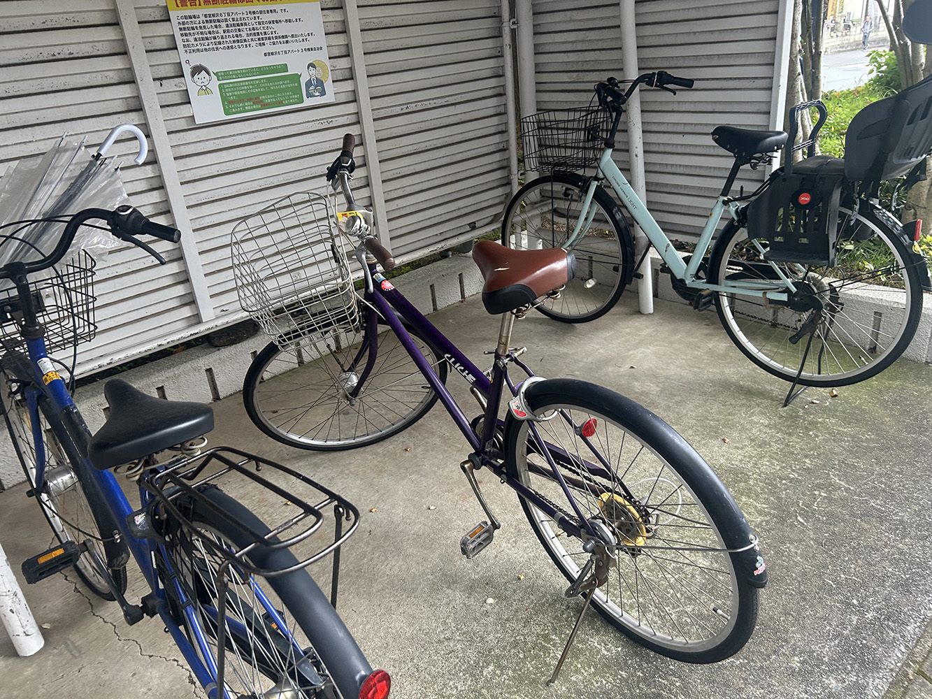 東会のシールは貼っているが、タイヤがパンクしている、大きく破損して走行できないなど、退去した住民が放置していった可能性のある自転車を駐輪場横の広場にまとめて移動しております。
