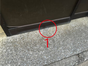 扉を支えている「1」の金具が破損しているために、扉が外れてしまう状態になっている。
