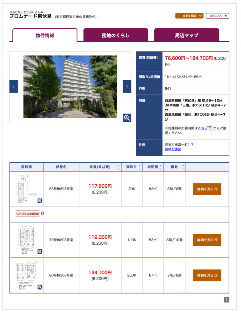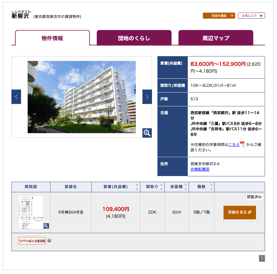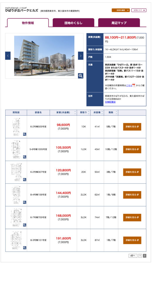 西東京市にあるUR物件の詳細です。確かに家賃に共益費部分が含まれているように感じられる価格設定です。